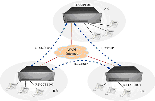 - 多個(gè)位于不同地點(diǎn)的RT-CCP1000通過(guò)廣域IP網(wǎng)互連,組成一個(gè)統(tǒng)一系統(tǒng),實(shí)現(xiàn)遠(yuǎn)程無(wú)縫通信。