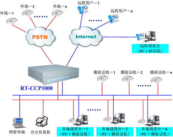 融天科技一體化IP調(diào)度指揮系統(tǒng)RT-CCP1000充分融入了先進的VOIP技術(shù),支持遠程IP用戶接入/遠程調(diào)度模式,該調(diào)度系統(tǒng)可廣泛地適用于部隊、鐵路、水力、電力、航空、礦山、石油、冶金、化工等企業(yè)與單位,系統(tǒng)組網(wǎng)圖大致如下: