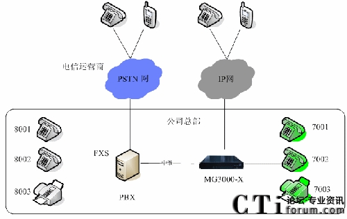 在公司總部增加一臺(tái)IPPBX(MG3000-X),通過中繼線與原有的PBX系統(tǒng)互聯(lián),在IPPBX上開通分機(jī)(7XXX), 新增員工的分機(jī):