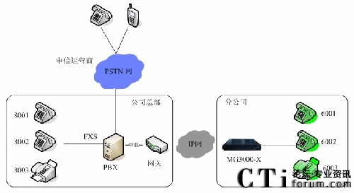 公司總部增加一臺(tái)語音網(wǎng)關(guān),通過中繼線與原有的PBX相連,異地分公司增加一臺(tái)IPPBX,下面開通分機(jī),公司總部和分公司通過IP網(wǎng)連接在了一起。