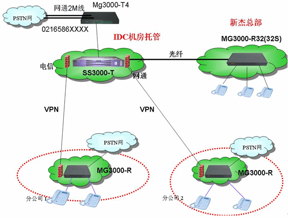 - 各地全部采用MG3000-R,通過VPN注冊到軟交換平臺上,S口接普通電話,O口接原來的模擬線,整個系統(tǒng)通過各地-R的O口實現(xiàn)長途落地的功能。