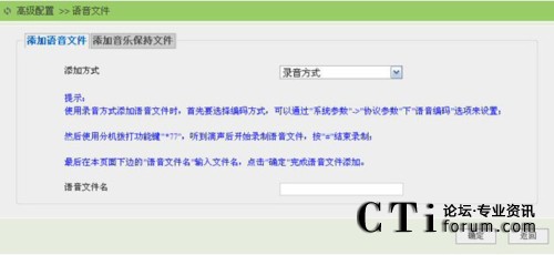 選擇錄音方式添加語音文件時(shí),使用分機(jī)撥打電話錄制語音文件功能鍵“*77”,聽到滴聲后開始錄制,按“#”號結(jié)束錄制。然后通過“高級配置”->“語音文件”,點(diǎn)擊“添加”鏈接按鈕進(jìn)入添加語音文件頁面,選擇添加方式為錄音方式,在語音文件名處為剛剛電話錄制的音文件,添加一個(gè)文件名后,點(diǎn)擊“確定”完成語音文件添加,如下圖所示: