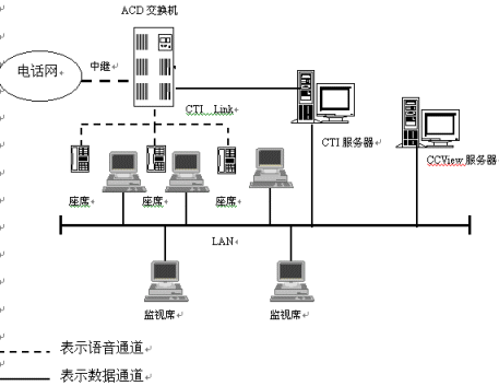 在呼叫中心系統(tǒng)中,ACD交換機除提供語音接入外,還提供高效的ACD(自動來話分配)功能,在本系統(tǒng),若需要監(jiān)視座席話機的狀態(tài),還必須提供計算機電話集成CTI功能。
