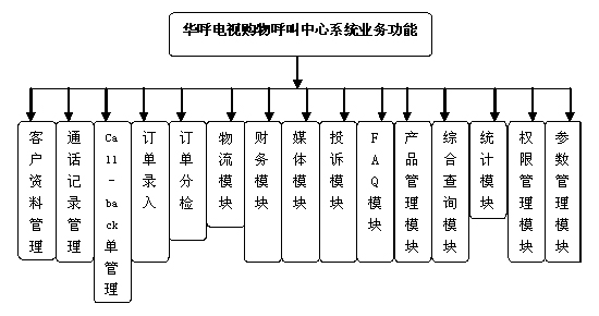 華呼電視購物呼叫中心系統(tǒng)業(yè)務(wù)功能結(jié)構(gòu)示意圖如下: