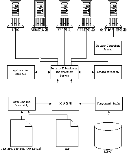 訪問層:訪問層包含Delano Campaign Server和Delano e-Business Interaction Suite。通過訪問層,利用現有的電子渠道與客戶交流,完成企業(yè)所制定的客戶關照流程。