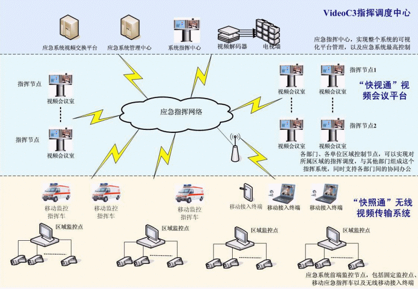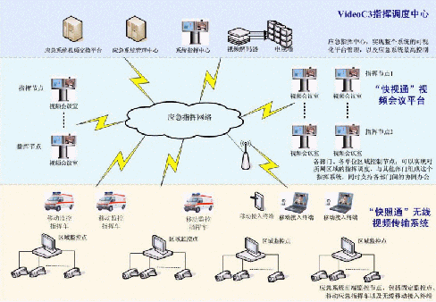 C3I視頻應(yīng)急指揮協(xié)同系統(tǒng)在政府IP網(wǎng)絡(luò)中處于城市的神經(jīng)中樞。它將政府各個(gè)部門(mén)、單位聯(lián)系成為一個(gè)整體。在C3I視頻應(yīng)急指揮協(xié)同系統(tǒng)的前端,由"快照通"無(wú)線視頻傳輸系統(tǒng)對(duì)政府所屬各個(gè)單位進(jìn)行實(shí)時(shí)監(jiān)控,時(shí)刻掌握現(xiàn)場(chǎng)動(dòng)態(tài),該部分支持固定點(diǎn)監(jiān)控,也支持移動(dòng)指揮點(diǎn)和無(wú)線移動(dòng)接入終端,保證了前方工作的靈活、機(jī)動(dòng)性;在系統(tǒng)的指揮中心部分,由VideoC3指揮調(diào)度中心來(lái)支持,它一方面需要對(duì)前端的監(jiān)控信息進(jìn)行控制,同時(shí),要對(duì)整個(gè)政府進(jìn)行綜合管理調(diào)度,在發(fā)生突發(fā)狀態(tài)的時(shí)刻,現(xiàn)場(chǎng)前端"快照通"捕獲的相應(yīng)信息通過(guò)C3I系統(tǒng)平臺(tái),迅速傳遞至指揮中心部分,政府管理人員通過(guò)VideoC3指揮調(diào)度中心對(duì)前端進(jìn)行遠(yuǎn)程指揮,在第一時(shí)間緊急處理現(xiàn)場(chǎng)突發(fā)事件;在整個(gè)C3I系統(tǒng)中,政府各個(gè)部門(mén)、單位之間通過(guò)"快視通"視頻會(huì)議平臺(tái)進(jìn)行辦公交流,支持各部門(mén)間的協(xié)同辦公,同時(shí),也可以通過(guò)其實(shí)現(xiàn)對(duì)所屬區(qū)域的指揮調(diào)度。