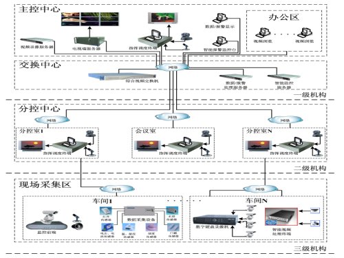 圖 4是一個(gè)典型的電力企業(yè)綜合視頻指揮調(diào)度系統(tǒng)網(wǎng)絡(luò)拓?fù)鋱D,在地理上可分一級(jí)機(jī)構(gòu)(主控中心操作顯示區(qū)、信息控制交換處理區(qū))、二級(jí)機(jī)構(gòu)(分控中心操作區(qū))、三級(jí)機(jī)構(gòu)(現(xiàn)場(chǎng)音視頻、數(shù)據(jù)、智能監(jiān)控點(diǎn)采集區(qū))。