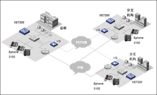 當企業(yè)存在多個大型分部的時候,如一個國際性公司。則可以在各個分部部署XE7000冗余方案,每個分部維護獨立的本地用戶信息。各小分支機構(gòu)的IP語音終端可以直接注冊到本地XE7000上,從而實現(xiàn)整網(wǎng)的分布式部署。