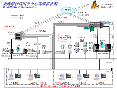 2005年1月底,由恒融數(shù)碼簽定的交通銀行太平洋信用卡中心客戶服務系統(tǒng)項目順利上線,該系統(tǒng)采用阿爾卡特的AcatelOmniPCX4400程控交換機系統(tǒng)、Genesys的 CTI架構(gòu)、EDIFY的IVR。一期擬提供CO端的接入線路為540線;外撥線路為 60線的外撥,480路的IVR服務、60路傳著服務、120個座席服務、20個專業(yè)外撥服務。