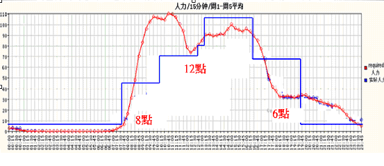 大家看到圖一中紅色的線(xiàn),就是一天里面電話(huà)進(jìn)來(lái)的數(shù)量,藍(lán)色的線(xiàn)是安排的人力。可以清楚看到:早上8點(diǎn)一開(kāi)始,電話(huà)就一直進(jìn)來(lái);中午來(lái)電的客戶(hù)開(kāi)始去吃飯,電話(huà)就開(kāi)始下滑;然后等到客戶(hù)吃完中飯,電話(huà)又開(kāi)始進(jìn)來(lái),下午又出現(xiàn)另外一個(gè)高峰;一直到5點(diǎn)以后又開(kāi)始下滑,6點(diǎn)以后電話(huà)相對(duì)就少很多。