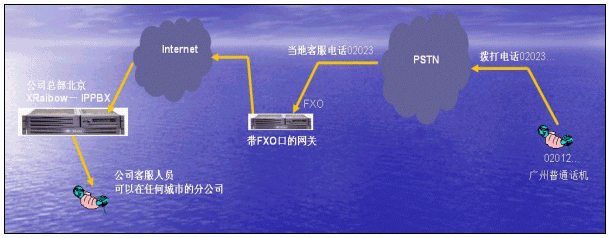 7.   以廣州地區(qū)客戶撥叫廣州公司電話為例,廣州地區(qū)的客戶撥打廣州公司的電話(市話),在廣州電話接起后,如果客戶需求沒(méi)有得到順利的答復(fù),在客戶電話保持的情況,可將電話轉(zhuǎn)接到在全國(guó)的任何一個(gè)IPPBX分機(jī)上。