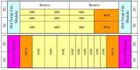 Carrier Manager)。即,MicroTCA系統(tǒng)的MCH相當于ATCA系統(tǒng)的ShMC+Fabric+Carrier。MCH采用了與AMC完全相同的連接方式,結(jié)構(gòu)尺寸與半寬全高的AMC模塊完全相同,連接方式也完全相同。