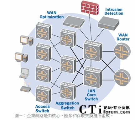 復(fù)雜的網(wǎng)絡(luò)拓?fù)?/b>:網(wǎng)絡(luò)架構(gòu)因內(nèi)含龐雜的多層網(wǎng)絡(luò),而變得越來(lái)越復(fù)雜。目前多數(shù)企業(yè)網(wǎng)絡(luò)都是三層式拓?fù)洌〝?shù)據(jù)匯聚層或分發(fā)層。許多網(wǎng)絡(luò)都已部署了匯聚交換機(jī),以彌補(bǔ)傳統(tǒng)存取及核心交換機(jī)欠缺高速光纖接口的缺陷,以便支持直接的連接。有些企業(yè)甚至建立了第四層網(wǎng)絡(luò),由連接到核心交換機(jī)的核心路由器組成。這樣的網(wǎng)絡(luò)架構(gòu)雖然可以發(fā)揮一定的作用,但卻大幅增加了資本支出,造成操作流程過(guò)于復(fù)雜,并為管理帶來(lái)沉重負(fù)擔(dān)。此外,這類(lèi)架構(gòu)也會(huì)增加網(wǎng)絡(luò)的等待時(shí)間,并導(dǎo)致超額負(fù)載的情況出現(xiàn),因而降低了應(yīng)用效能。