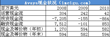 2008、2009、2010財年Avaya公司運營現金流分別為3.04億美元、2.42億美元、4200萬美元,2010財年運營現金流急劇減少因并購北電的企業(yè)通信部門(NES)影像所致,截至2010財年(即2010年9月30日)Avaya公司現金及等價物為5.94億美元。