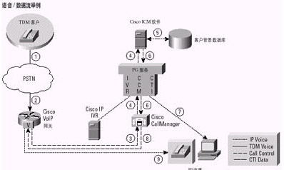 注意2:這一樣本語音/數(shù)據(jù)流描述了一個單地點IPCC實現(xiàn)。另外,可以將IPCC集成到一個多地點聯(lián)絡中心,并獲得ICM軟件所提供的可貫穿整個企業(yè)的、網(wǎng)絡級的路由預選功能所能帶來的好處。