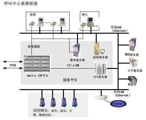 Harris IXP平臺:在本系統(tǒng)中作為交換接入部分,具備R2、SS7、PRI/BRI等多種信令的接入,提供智能ACD分配方案。