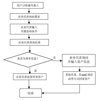 系統(tǒng)自動報受理人員工號,人工交互式受理方式。受理人員根據(jù)用戶要求從服務質(zhì)量標準數(shù)據(jù)庫、電費數(shù)據(jù)庫和其他相連的數(shù)據(jù)庫查詢資料,然后通過語音方式播報資料或送到用戶指定的傳真機或其他終端設備上。主要內(nèi)容如下: