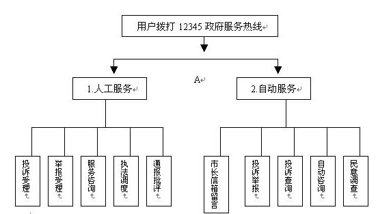 當(dāng)用戶撥通"12345"電話并選擇自動服務(wù)時,聲訊臺自動播放引導(dǎo)語"選擇市長信箱留言請按1,自動投訴舉報請按2,投訴查詢請按3,服務(wù)咨詢請按4,民意調(diào)查請按5。