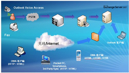 客戶端可以通過Outlook,Web,固話語音和手機接入,查看相關(guān)的郵件以及日程安排等信息。如下圖: