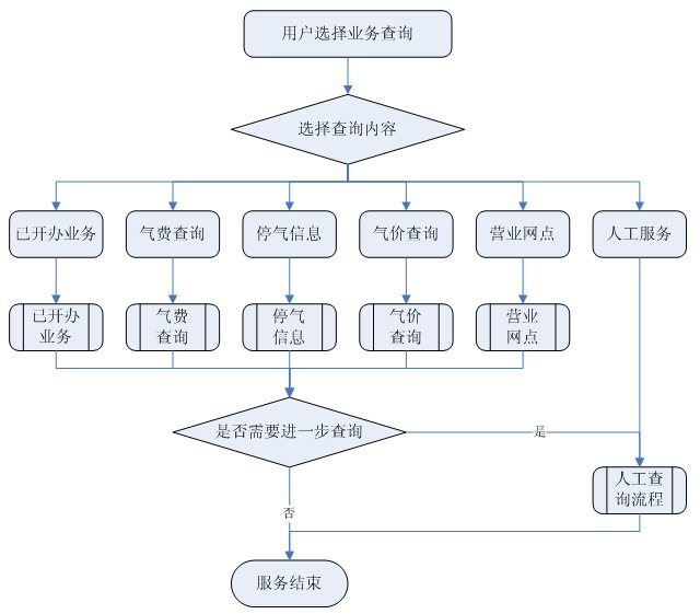 業(yè)務(wù)查詢:用戶可通過受理人員或自動語音應(yīng)答系統(tǒng)根據(jù)用戶要求從數(shù)據(jù)庫查詢資料,然后通過語音方式播報或送到用戶指定傳真機(jī)或其他終端設(shè)備上。應(yīng)考慮以后用web方式查詢氣費(fèi)等數(shù)據(jù),以不動及主體設(shè)備方式平滑升級。