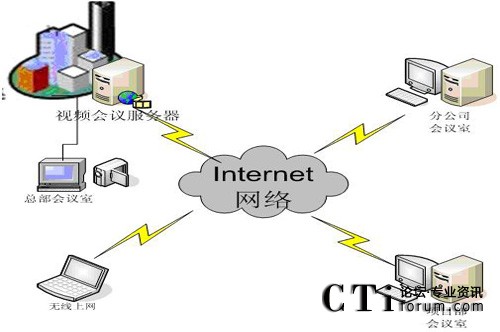 視維根據(jù)互聯(lián)網(wǎng)的網(wǎng)絡(luò)現(xiàn)狀和IT硬件資源制定了一套可行的平民化的低帶寬下的高清視頻會議解決方案。以企業(yè)總部為主會場,其他地區(qū)的分公司、各營銷網(wǎng)點(diǎn)和各移動多媒體終端作為分會場,其網(wǎng)絡(luò)拓?fù)鋱D如下: