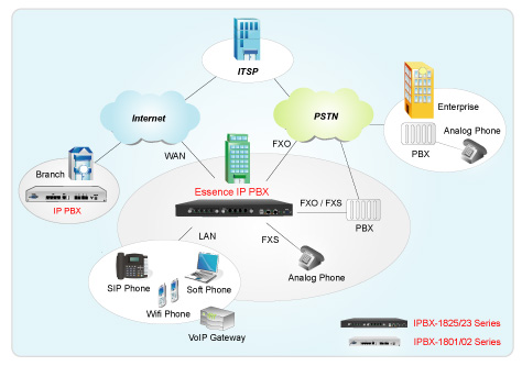 如圖所示,Essence IPBX 系列可透過內(nèi)建之FXO或是ISDN接口與公共電話網(wǎng)(PSTN)或基于傳統(tǒng)PBX的企業(yè)電話網(wǎng)連接在一起。