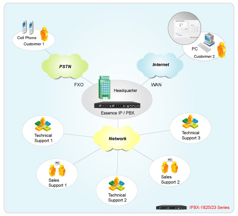 Essence IPBX系列可以注冊(cè)者之形式注冊(cè)于其他SIP協(xié)定伺服器上,如ITSP運(yùn)營(yíng)平臺(tái),或是分公司之小型IP PBX注冊(cè)至總公司之大型IP PBX ,均可透過Internet 將話務(wù)無限延伸。