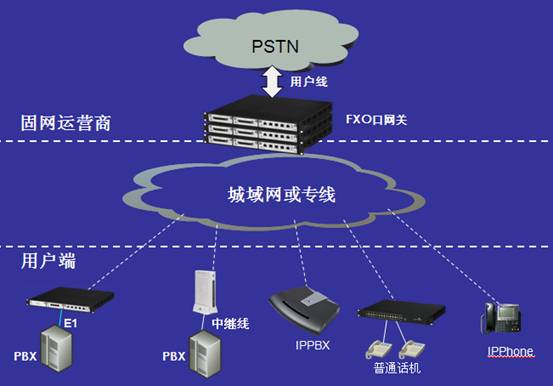 “固網(wǎng)IP化”方案無需軟交換,延用現(xiàn)有的數(shù)字程控交換機(jī)與業(yè)務(wù)支持系統(tǒng)作為核心網(wǎng)業(yè)務(wù)平臺(tái),只是在交換機(jī)外圍增加實(shí)現(xiàn)模擬/數(shù)字語(yǔ)音信號(hào)轉(zhuǎn)換成IP的VoIP網(wǎng)關(guān),并通過IP網(wǎng)絡(luò)實(shí)現(xiàn)與遠(yuǎn)程客戶終端設(shè)備的連接。遠(yuǎn)程的用戶端設(shè)備可以是傳統(tǒng)設(shè)備,如普通電話、傳真機(jī)或小型交換機(jī),也可以是基于IP的語(yǔ)音設(shè)備,如SIP電話、IPPBX等(如下圖所示)?梢詫(shí)現(xiàn)小區(qū)放號(hào)、企業(yè)直線電話、企業(yè)語(yǔ)音交換機(jī)接入等業(yè)務(wù)。