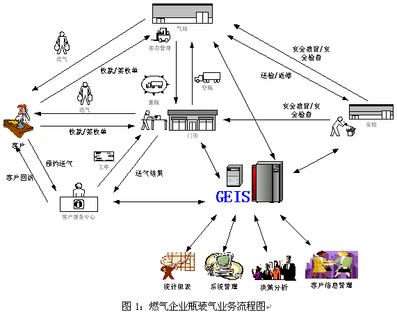 GEIS燃?xì)膺\(yùn)營(yíng)管理信息系統(tǒng)的應(yīng)用是企業(yè)的長(zhǎng)期發(fā)展的驅(qū)動(dòng)力,它是一套以客戶服務(wù)接觸中心為龍頭、以運(yùn)營(yíng)生產(chǎn)流程管理為龍身、以經(jīng)營(yíng)分析為龍尾的閉環(huán)信息處理系統(tǒng)。它由客戶服務(wù)中心子系統(tǒng)、門市業(yè)務(wù)子系統(tǒng)、氣站管理子系統(tǒng)、安全搶修平臺(tái)和管理與集成模塊組成。實(shí)踐的事實(shí)告訴我們,它起到保持客戶忠誠度、提升企業(yè)品牌影響力、提高業(yè)務(wù)運(yùn)作效率、加快業(yè)務(wù)經(jīng)營(yíng)決策和促進(jìn)企業(yè)持續(xù)發(fā)展的作用。