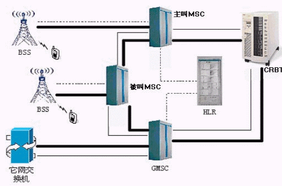 移動網絡CRBT解決方案主要由網關移動業(yè)務交換中心(GMSC),移動業(yè)務交換中心(MSC),歸屬位置寄存器(HLR),CRBT平臺等部分組成,其中需要使用GMSC實現(xiàn)與它網交換機進行互聯(lián),網絡拓撲圖如下: