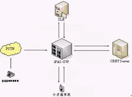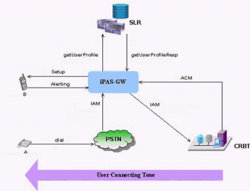 以UT斯達康的iPAS網絡為例進行說明,被叫端局的iPAS-GW 可根據用戶的屬性決定用戶是否訂閱CRBT業(yè)務,如果被叫用戶訂閱了該項業(yè)務,則 iPAS-GW 將呼叫轉到CRBT平臺,由該平臺在被叫號碼前加撥特殊前綴后繼續(xù)向iPAS-GW發(fā)起新的呼叫,同時根據主叫號碼所選擇個性化鈴聲向主叫用戶放音,而iPAS-GW則直接接續(xù)被叫小靈通用戶,當被叫用戶摘機后,CRBT平臺負責將主、被叫接通,也就是說在通話過程中始終要占用CRBT平臺的話路資源和 iPAS-GW 的中繼資源。如下圖所示: