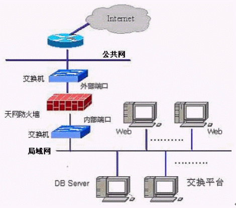 對整個系統(tǒng)網絡的保護首先要從保護內部網絡避免受到Internet網上的攻擊為主,可以采用高可靠性的防火墻作為主要手段,網絡拓撲圖如下圖所示: