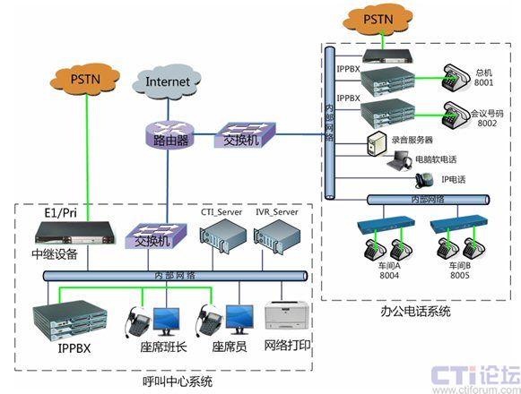 化。在總部核心機(jī)房將電話外線中繼接口與中繼網(wǎng)關(guān)設(shè)備連接,并通過內(nèi)部網(wǎng)絡(luò)對接到IPPBX,分別應(yīng)用于辦公電話系統(tǒng)和公司呼叫中心系統(tǒng)。設(shè)備用于公司辦公電話和公司會議系統(tǒng),可最大支持到30方會議,或多個小型獨立會議系統(tǒng)。各個不同的車間可以采用電話線之間接入分機(jī),或采用傲威AVG800的網(wǎng)關(guān)通過網(wǎng)絡(luò)接入,并注冊到IPPBX系統(tǒng)實現(xiàn)內(nèi)網(wǎng)網(wǎng)絡(luò)分機(jī)。對將來的分公司的辦公電話系統(tǒng),將不再使用傳統(tǒng)的PBX設(shè)備,而是直接利用IPPBX系統(tǒng),通過IP