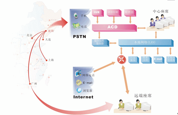 對于地區(qū)分布廣泛,而又要集中管理的企業(yè),可在各個局部地區(qū)設置遠端座席,并通過網絡方便的接入中心系統(tǒng)。我們?yōu)檫h端座席提供與中心座席完全相同的操作,遠端座席可以根據各個地區(qū)的特定情況有針對性的處理各個局部地區(qū)的業(yè)務,為中心分流壓力,同時中心系統(tǒng)也可以完全掌握遠端座席的情況。我們可以非常明確的一點是:采用分布式座席的技術,使得遠端座席與中心座席除了地域上的差異,其它部分完全相同?梢哉f只要網絡無極限,座席分布就是無極限的。