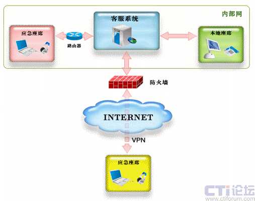 配置應(yīng)急座席的必要條件之一是網(wǎng)絡(luò)環(huán)境,要求應(yīng)急座席家庭計算機(jī)能夠連接到Internet或能夠直接訪問客服系統(tǒng)內(nèi)部網(wǎng)絡(luò),位于客服網(wǎng)絡(luò)防火墻之外需要通過相應(yīng)的技術(shù)連接到系統(tǒng),實現(xiàn)對系統(tǒng)的訪問。
