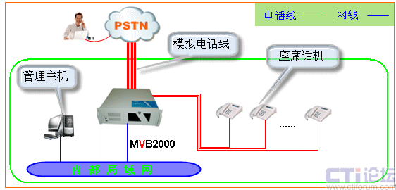 4. 用電話線將座席電話機(jī)與MVB2000相連,將電話線插到MVB2000的FXS接口卡的對(duì)應(yīng)接口;