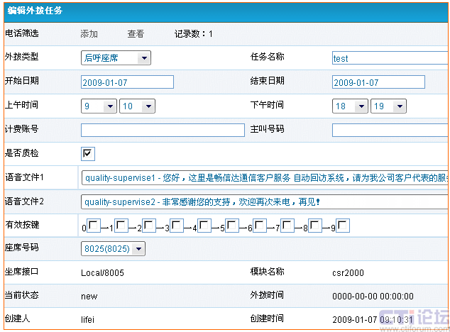 外撥任務(wù)管理:用來生成一個(gè)或多個(gè)外撥任務(wù)。添加外撥任務(wù)的流程是:1、選擇外撥數(shù)據(jù)中的號(hào)碼,2、選擇外撥類型(語(yǔ)音通知、自動(dòng)調(diào)查回訪、呼叫座席、接通指定應(yīng)用、執(zhí)行撥號(hào)腳本等),3、命名任務(wù)名稱,4、設(shè)定任務(wù)時(shí)間,5、根據(jù)不同的外撥類型設(shè)置外撥后的電話內(nèi)容,6、設(shè)定座席號(hào)碼(可設(shè)置一個(gè)或者多個(gè)座席)。