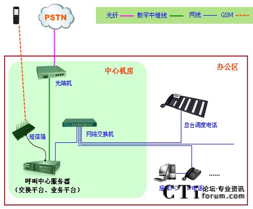 維佳元?jiǎng)?chuàng)呼叫中心系統(tǒng)采用暢信達(dá)通信呼叫中心交換平臺(tái)與業(yè)務(wù)平臺(tái),采用1路E1數(shù)字中繼線(xiàn)接入,對(duì)外公布一個(gè)400號(hào)碼與10多個(gè)辦公電話(huà)號(hào)碼,采用IP話(huà)機(jī)作為總臺(tái)調(diào)度電話(huà)、座席電話(huà)與辦公電話(huà),系統(tǒng)架構(gòu)形式如下: