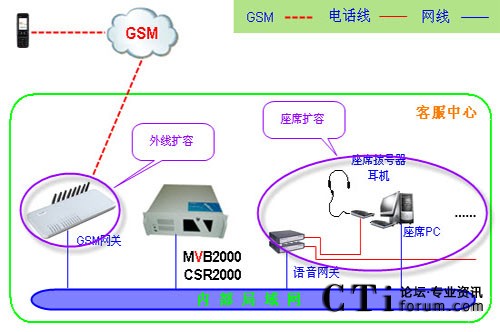 呼叫中心用于30路GSM網(wǎng)絡(luò)接入、20個座席人員使用,要求以后可擴展到50座席人員或者更多。