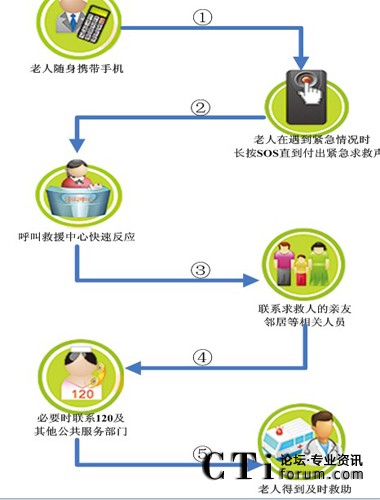老人使用不記任何電話號,按下紅鍵(盲人按粗糙鍵)就可發(fā)送緊急求救信號;按下綠鍵可以發(fā)送求助信號,求助信息根據(jù)用戶需要在同一時間發(fā)送到信息服務(wù)中心、社區(qū)網(wǎng)格管理員、老人指定親屬、物業(yè)公司、及有關(guān)部門,可實(shí)現(xiàn)完整信息獲取和快速響應(yīng),啟動多方通話進(jìn)行緊急調(diào)度,保障老人的生命財(cái)產(chǎn)安全。