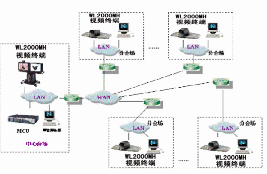 分會場配置WL-2000MH會議終端,具有快速以太網(wǎng)LAN接口,在H.323上可達到4M。實際應(yīng)用中,分會場工作速率在512K-2M自適應(yīng)可調(diào)。中心會場可通過局域網(wǎng)對分會場設(shè)備遠程管理。終端通過RS232口連接攝像機,中心會場可進行遙控分會場的攝像機,注本地也可以進行攝像機控制。WL-2000MH會議終端有兩路視頻輸出,一路為遠端視頻,一路為本地視頻,分會場可選擇兩個顯示設(shè)備如大屏幕彩電或背投電視。