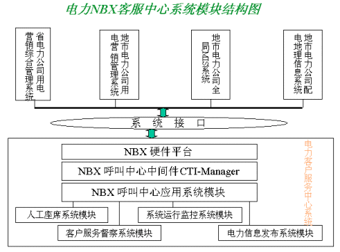 該方案以美國(guó)3COM公司的NBX產(chǎn)品為系統(tǒng)平臺(tái),結(jié)合其配套的中間件產(chǎn)品CTI-Manager和上層第三方專(zhuān)業(yè)的電力行業(yè)應(yīng)用系統(tǒng),為各省、市電業(yè)公司建立起新型的電力呼叫中心(Call Center)。使電力客服中心系統(tǒng)以呼叫中心為基礎(chǔ),以電力系統(tǒng)其他后方資源信息(CIS,DMS,負(fù)控等系統(tǒng))為依托,為客戶(hù)提供電話、傳真、郵件、Internet等多種接入方式,通過(guò)和電力其他業(yè)務(wù)系統(tǒng)有機(jī)的結(jié)合,滿(mǎn)足客戶(hù)不同層次、個(gè)性化與多樣化的業(yè)務(wù)需求,提供了包括錄音、會(huì)議電話、統(tǒng)一消息和智能路由在內(nèi)的多種功能。