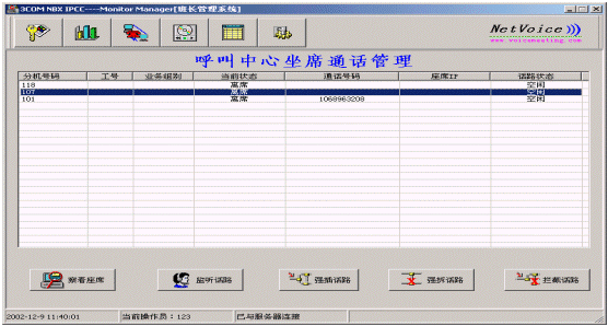 系統(tǒng)提供實(shí)時(shí)直觀的監(jiān)控界面,并提供各類實(shí)用的坐席監(jiān)控方法如:監(jiān)聽(tīng)、強(qiáng)插、強(qiáng)拆等功能操作,從而實(shí)現(xiàn)了對(duì)各應(yīng)用坐席的強(qiáng)有力的監(jiān)控、管理功能。