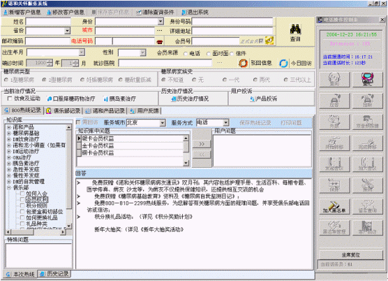 諾和關(guān)懷糖尿病服務(wù)中心的服務(wù)坐席可以實(shí)現(xiàn)患者信息的同步提示功能,當(dāng)電話被分配至坐席的同時(shí),患者的資料信息也同步出現(xiàn)在PC終端上。同時(shí)坐席終端可以自動記錄對方的電話號碼,也可以實(shí)時(shí)顯示正在排隊(duì)等待的人數(shù),提示服務(wù)人員加快業(yè)務(wù)受理速度。
