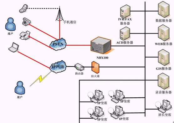 求助中心熱線系統(tǒng)采用華為-3COM 的 NBX100 網(wǎng)絡(luò)交換機作為呼叫接入設(shè)備,基于純IP交換技術(shù),座席電話全部采用IP話機,部署方式靈活。求助中心系統(tǒng)主要負(fù)責(zé)受理市民投訴,并派發(fā)到相關(guān)二級網(wǎng)絡(luò)單位;網(wǎng)絡(luò)單位系統(tǒng)主要負(fù)責(zé)處理中心下發(fā)的投訴單據(jù),并進行反饋,同時,網(wǎng)絡(luò)單位也可自行受理投訴,并進行相應(yīng)的上傳和下發(fā),多級網(wǎng)絡(luò)單位之間可實現(xiàn)級聯(lián)。為了簡化單據(jù)中轉(zhuǎn)流程,求助中心系統(tǒng)在網(wǎng)絡(luò)派單的基礎(chǔ)上,還結(jié)合自動傳真、短信群發(fā)等技術(shù),提供了自動傳真派單、自動短信派單等多種單據(jù)派發(fā)功能,極大的提高了單據(jù)處理效率。