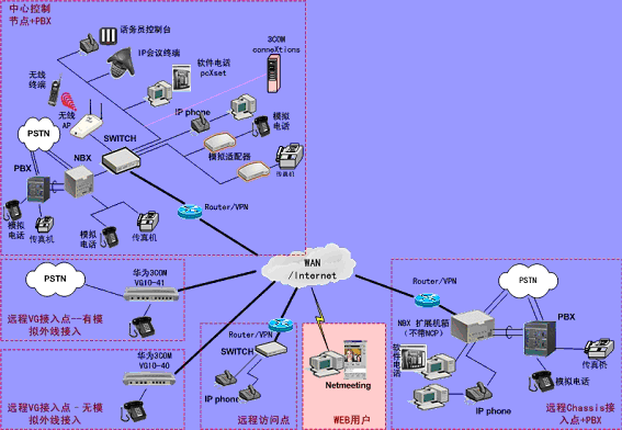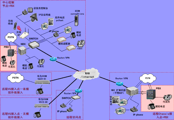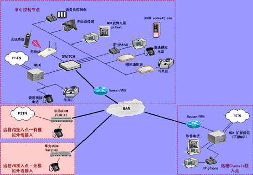 ③.遠程接入的辦公室不再需要專用的 PBX, 只需要將3Com NBX電話終端接入到WAN網(wǎng)中,就能地實現(xiàn)在WAN或Internet上與3Com NBX 網(wǎng)絡電話系統(tǒng)的互連。