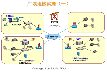 一些企業(yè)目前已經(jīng)擁有PBX系統(tǒng),如何既利用現(xiàn)有PBX,同時又可以發(fā)揮NBX的優(yōu)勢。這是需要通過WAN網(wǎng)進行語音通信的企業(yè)經(jīng)常遇到的問題。解決的方案是:
