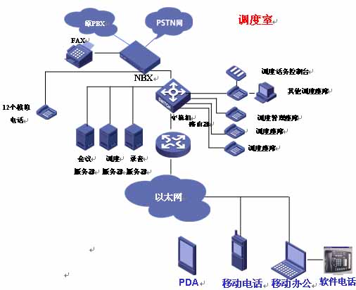 北京市交通應(yīng)急指揮中心,此次項目采用了1500個設(shè)備容量的華為3Com V3000 NBX系統(tǒng)一臺為核心語音調(diào)度交換機,連接PSTN網(wǎng)。使用3101標準版IP智能話機、3102商務(wù)版IP智能話機和3105話務(wù)臺總數(shù)量達到了34部。在已有的網(wǎng)絡(luò)結(jié)構(gòu)中實施語音系統(tǒng),減少對網(wǎng)絡(luò)基礎(chǔ)設(shè)施的投資,節(jié)省話路設(shè)備成本、電話系統(tǒng)安裝、維護和使用管理,還可提供更多的通信業(yè)務(wù)和更強的智能語音功能。結(jié)構(gòu)圖如下: