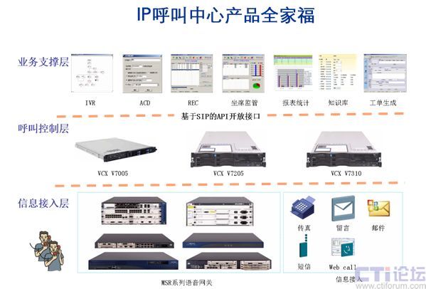 3、“信息接入層”通過PSTN(MSR)、短信、郵件、留言、WEB CALL等信息通訊手段,使傳統(tǒng)的語(yǔ)音呼叫中心便捷的擴(kuò)展為多媒體的呼叫中心。