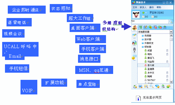 UcSTAR:Unified Communication Star,是擎旗技術研發(fā)的統(tǒng)一通訊平臺,它為企業(yè)提供多種通訊手段(企業(yè)即時通信、視頻、語音、郵件、短信、電話、MSN/QQ互通等),并可融合企業(yè)的各種應用系統(tǒng)(OA、ERP、CRM、網站、電子商務系統(tǒng)等);將企業(yè)對外溝通、銷售和服務、對內溝通和協(xié)作無縫整合;輕松實現(xiàn)無地域/時間限制的,可管理、可控制、可擴展的,集內外部溝通、服務和銷售一體化的統(tǒng)一工作平臺。此外,它也可被分離應用為企業(yè)IM及實時協(xié)作系統(tǒng)、多媒體呼叫中心系統(tǒng)、專業(yè)級的IP視頻會議系統(tǒng)等。